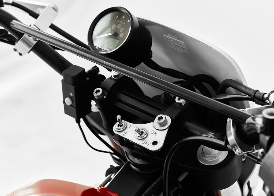 В процессе работы над кастом мотоциклом были убраны неказистый обтекатель фары и защитные дуги, заводской топливный бак оставили на месте и немного изменили подрамник. Спереди установили классическую фару с обтекателем от эндуро и переднее крыло также от эндуро. Поставили новый руль Tommaselli и новую защиту рук.