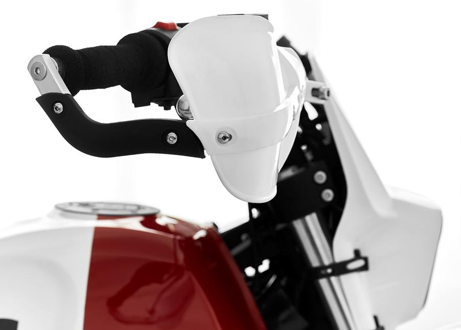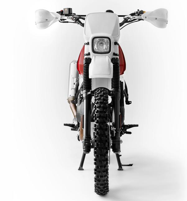 Этот красно-белый мотоцикл, специально построенный для Scram Africa 2019, готов к испытанию грязью и песком, и мы уверены, что он их преодолеет, как и славные мотоциклы Париж-Дакар.