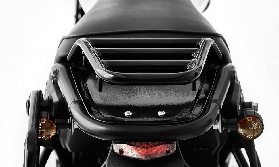 Руль мотоцикла обзавелся небольшим спидометром Koso, кастомной панелью с переключателями и новыми грипсами. Одна из кнопок теперь включает и выключает ABS Enfield – дополнительная функция от Fuel. Есть даже USB-порт для зарядки, так что любой, кто управляет этим скрамблером, может постоянно обновлять Instagram (шутка). Далее было установлено одинарное сидение, убраны подножки пассажира (но оставлены для них крепления, чтобы все вернуть назад). Место пассажира закрыли крышкой со съемным кастомным багажником.