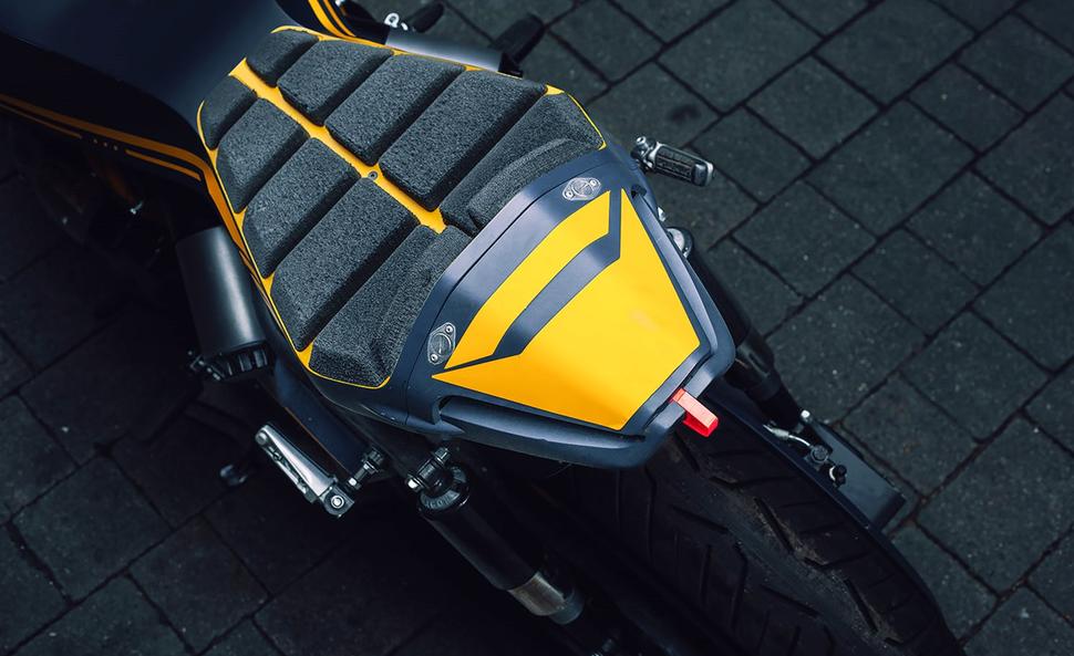 А поверх мотоцикла устанавливается кожух-монокок, закрывающий штатный бензобак Royal Enfield Shotgun 650 и оканчивающийся острым хвостовым горбом со съёмной крышкой заднего седла. В роли седла выступает сетка из брусков вспененного материала, а кастомный акриловый задний фонарь выступает из хвоста сзади.