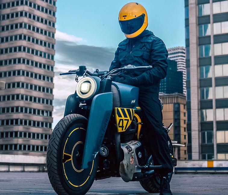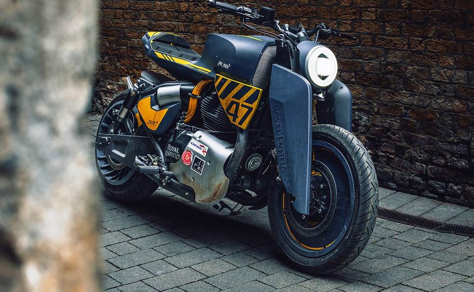 Работая в тесном сотрудничестве с лондонским многопрофильным художником и музыкантом Гайкой Таваресом, команда создала бесчисленное множество вариантов дизайна, черпая вдохновение из научно-фантастических примеров, кинокультуры киберпанка и уличной моды. После долгого допиливания, лучшие идеи были объединены для создания окончательного дизайна - "анархического кастомного мутанта", по словам Royal Enfield.