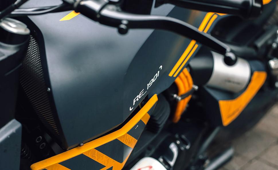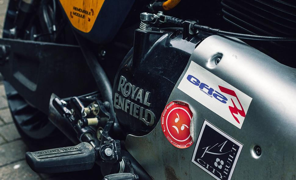 Большинство элементов обвеса напечатали на 3D-принтере из стеклонаполненного нейлона в лабораториях Royal Enfield. Что касается окраски и наклеек, то их выполнила та же команда, которая разрабатывала схемы и графику для текущих моделей Royal Enfield.