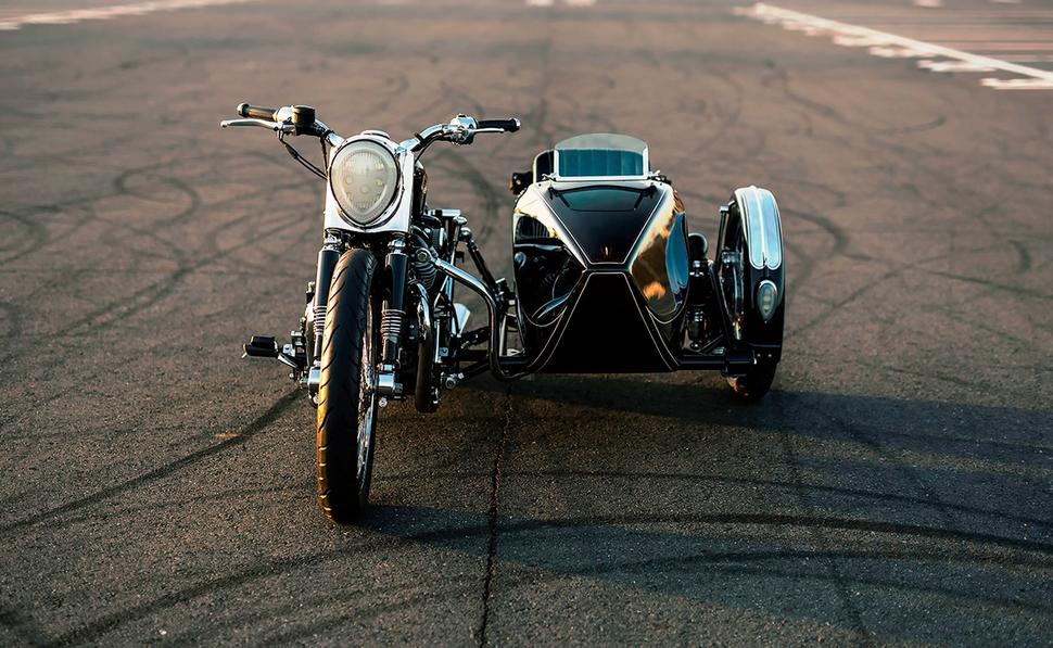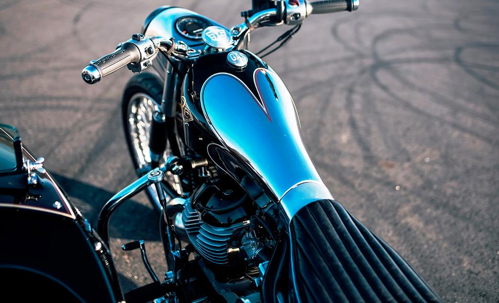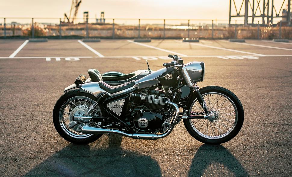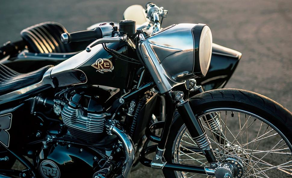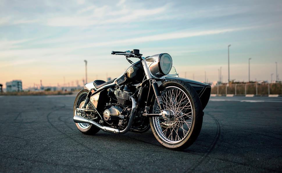 Если с Royal Enfield Super Meteor 650 повезло и он остался почти в стоке, то коляску пришлось делать с нуля под стиль Challenger-а. Куросу объединил дизайны винтажных колясок с силуэтом кломпов (традиционных голландских деревянных башмаков), а затем вручную изготовил из пенопласта макет, по которому создал корыто из стеклопластика.