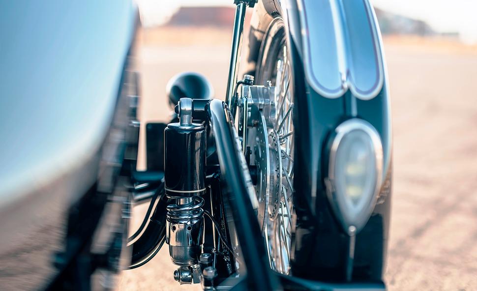 Для облегчения руления Royal Enfield Super Meteor 650 с коляской пришлось укоротить в части трейла, так что Куросу прилично переделал вилку, вдохновляясь вилками Earles 50-60х годов. Эту конструкцию оценили многие крупные производители за её прочность и возможность регулировать положение оси для уменьшения трейла, когда к мотоциклу прикрепляется коляска.