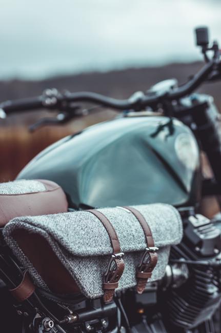 На замену ему пришёл намного более подходящий бак от Suzuki GS850 1980 года, несколько переделанный для более стильной формы, но сохранивший объём под стать габаритному двигателю Moto Guzzi. Высокое заднее крыло защищает от брызг с колеса, а выполненное вручную переднее на кастомных креплениях довольно плотно прилегает к резине. Восхитительное сиденье и боковые кофры из заказного твида Harris и кожи были выполнены Viking Motorcycle Seats.