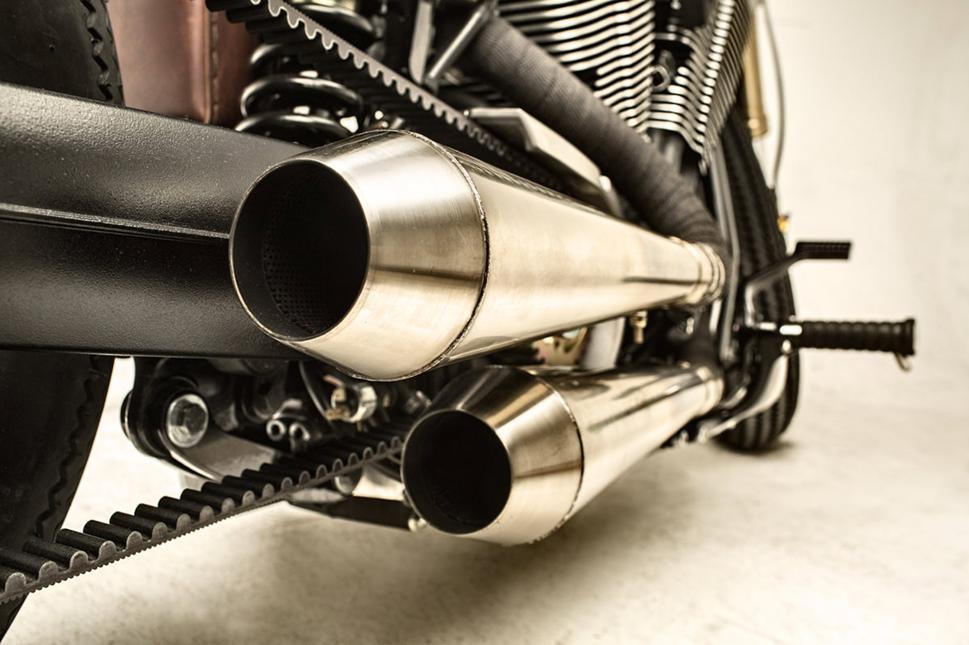 Последним в списке работ значился двигатель. Но Victory и без того выдает достойные 97 лошадиных сил, тем более теперь мотоцикл стал на 45 кг легче, поэтому усовершенствования мотора были минимальны. Впускная система Lloydz Torque Tube помогает двигателю дышать, также был отрегулирован момент зажигания и установлен новый регулятор подачи топлива. На кастомные коллекторы были установлены конусообразные глушители Cone Engineering.