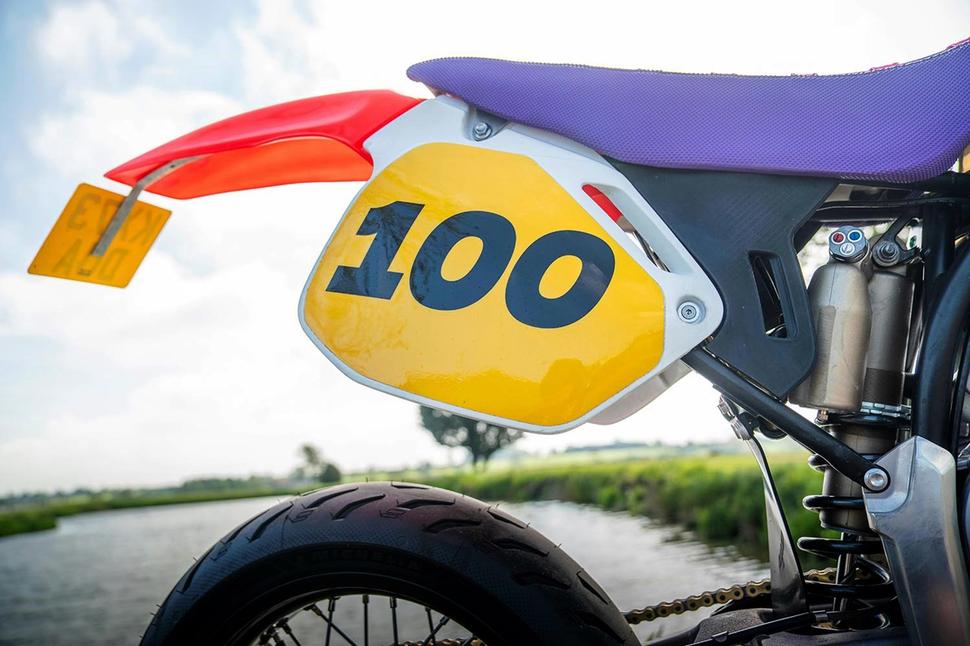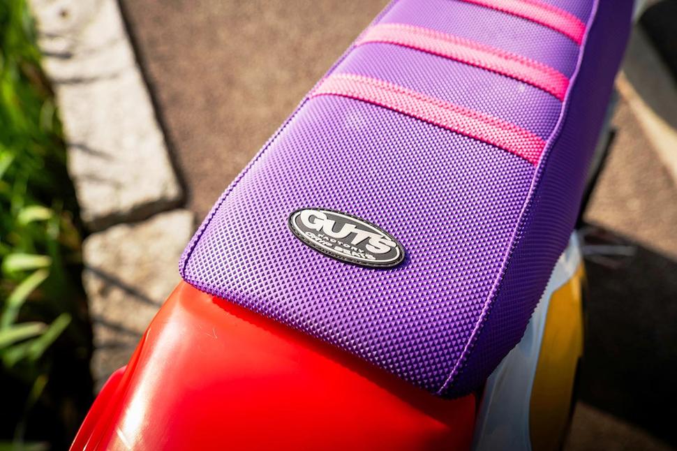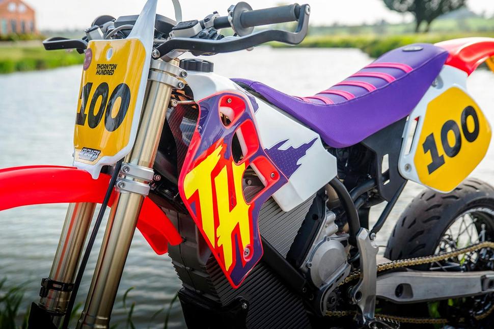 Это означало, что штатное сиденье уже не подойдёт. Не вопрос: парни нашли старое потрёпанное седло от CR250 92 года и порвали его, чтобы добраться до пластиковой основы. Её покрыли инжектированной пеной, а затем ребята из GUTS организовали для Джоди шикарную фиолетово-розовую обшивку сиденья. Остальные элементы оформили ребята из GP Grafix, которые разработали и напечатали уникальный взгляд на тему CR500 из тех времён, да ещё и весьма в духе Thornton Hundred. Номер на гоночной табличке говорит сам за себя, а с подрамником, покрытым порошковой краской чёрного цвета под стать раме Stark, он создаёт по-настоящему цельную картинку.