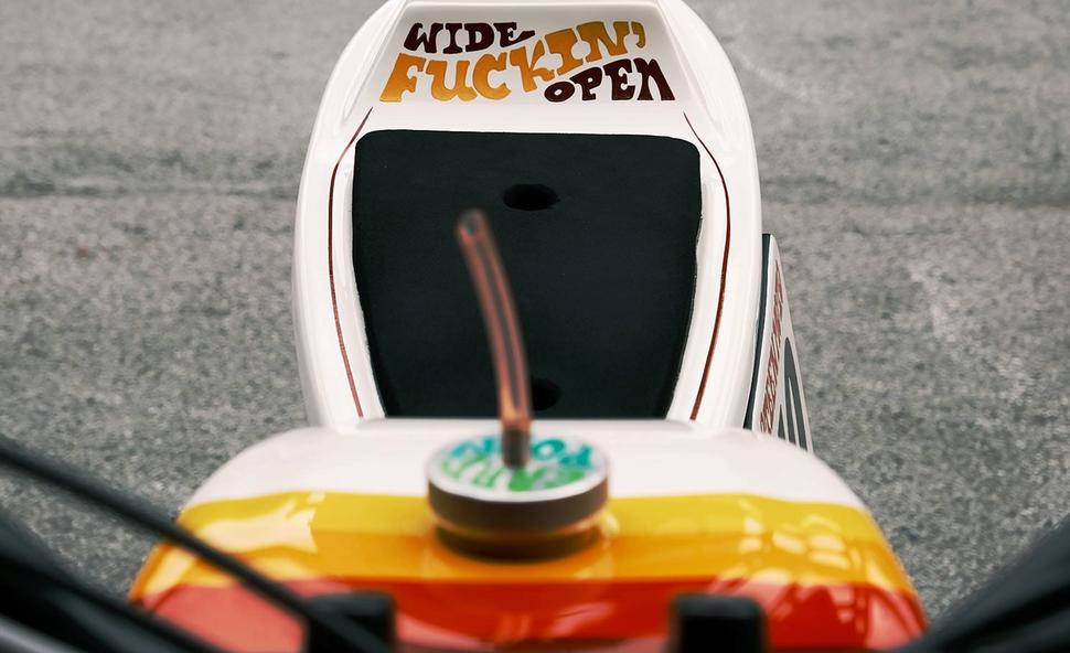 Компания Hattech изготовила на заказ выхлоп из нержавейки. Оба патрубка плавно сходятся на левой стороне мотоцикла, где оканчиваются парой глушителей-тромбонов. Затем дело дошло до правильного обвеса, и команда начала с установки реплики бензобака Harley XR750 и небольших доработок рамы для того, чтобы бак сидел ниже. Для повышения жёсткости рядом с рулевой колонкой была приварена дополнительная труба.