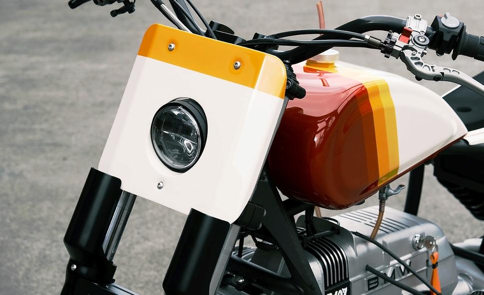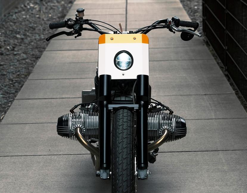 Спереди в узком алюминиевом кожухе стоит диодная фара J.W. Speaker. Ниже установлена кастомная распорка вилки, а по бокам от неё расположены стеклопластиковые флэт-трекерные защитные накладки на перья. Бьёрн решил отказаться от одного из передних тормозных дисков R 100 R ради более динамичного внешнего вида.