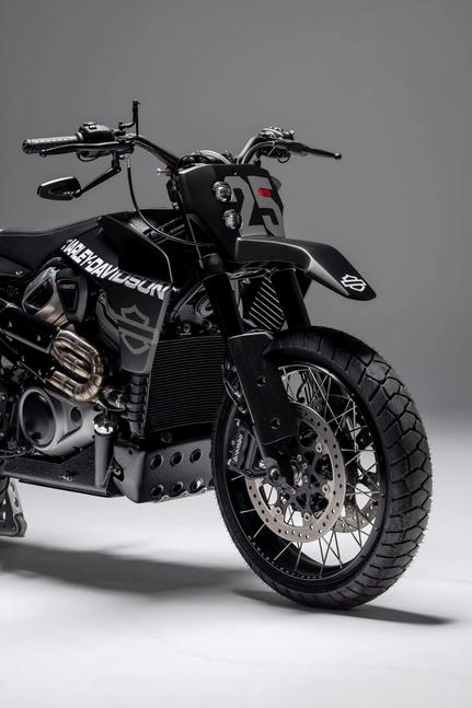 Большой ветровик и странная заводская фара были убраны, а вместо них установлена номерная табличка со встроенными диодными фарами Highsider и фактурным передним крылом. Штатную приборную панель встроили в верхнюю часть кожуха бензобака, а сзади установили алюминиевый хвост и боковые панели, красиво выполненные и довольно массивные, под стать остальному мотоциклу. Матово-чёрную окраску с логотипами HD, новым именем супер-скремблера и номером 25 (это просто две средние цифры из 1250, кубатуры PanAm) выполнил Джастин из Popbang Classics.