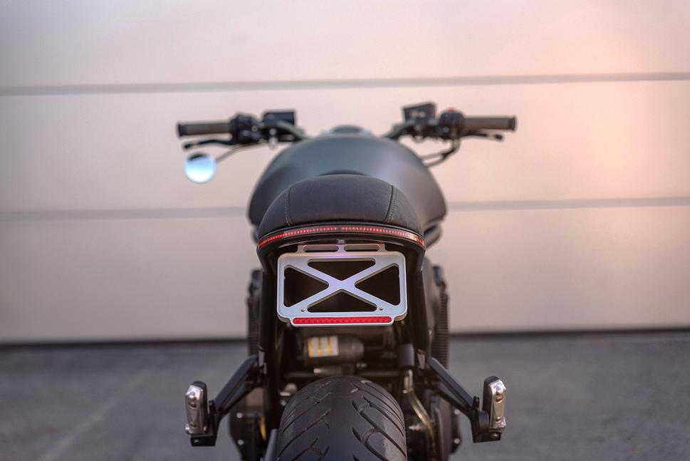 Большое переднее крыло Suzuki Bandit было убрано, а затем изготовлена новая форма для небольшого крыла. Вместо стеклопластика Сандер использовал карбоновый композит, но всё равно окрасил его, чтобы оно не выделялось - делая проект в едином стиле, негоже выпендриваться карбоновым крылом, даже если оно получилось лёгким и гладким. Сотни новеньких нержавеющих болтов ушло на замену старым, в том числе для крепления вручную изготовленной защиты цепи. Минималистичная светотехника и многофункциональный спидометр идеально подчеркнули лаконичность дизайна, а кастомное крепление номерного знака стало ещё одним упражнением Сандера в искусстве фрезерования.