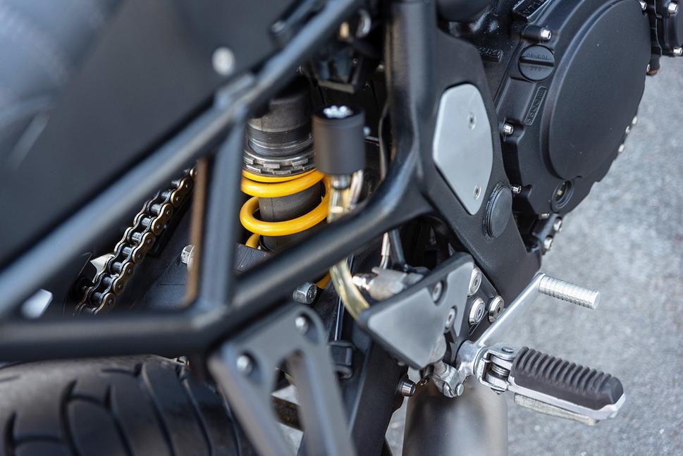 Перед тем, как ставить их на место, усталые пружины были вытащены, старое душистое масло заменено на свежее, и были установлены прогрессивные внутренние пружины YSS. Траверсы были покрыты порошковой краской, а верхняя была слегка обработана фрезером и на неё установлены фрезерованные же проставки для руля Renthal. Bandit-ы имеют заслуженную славу "ленивых жоп" - в самом буквальном смысле, их заднее колесо довольно неохотно слушается в поворотах. Для того, чтобы сделать управление острее, Сандер установил амортизатор от Kawasaki ZX10R, который потребовал переделки верхнего крепления для компенсации разницы в длине. Затем были перебраны тормоза Suzuki Bandit и обновлены колёса.