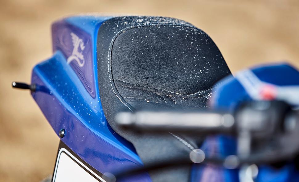 В новом хвосте мотоцикла находится компактная литий-полимерная батарея, а оригинальная электрика (включая ABS) спрятана под обшитым микрофиброй сиденьем, для которого Дирк сделал основу, чтобы защитить проводку. Радиатор был спрятан под левой боковой накладкой на бак.