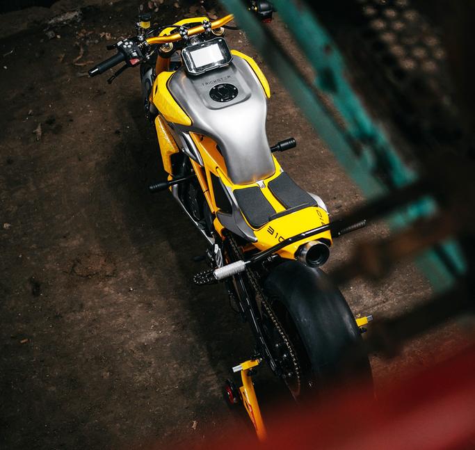 Вдохновляясь мотоциклами для станта, ребята из индонезийской мастерской преобразили RTR, придав ему инсектоидный вид, от которого бы дизайнеры KTM благоговейно прослезились. Проект назвали "Trickster" - то есть, трюкач, практически то же самое, что и стантер.