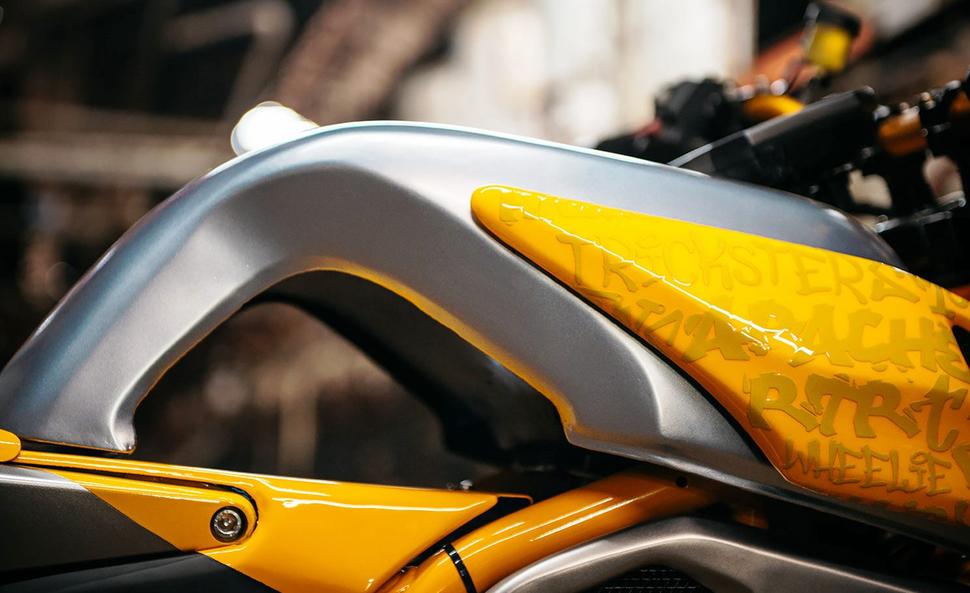 Хвост сзади прикрыт защитной дугой с парой подножек для стоячих вилли и других трюков. Пара диодных фонарей плотно встроена рядом с выходом кастомного глушителя под сиденьем.