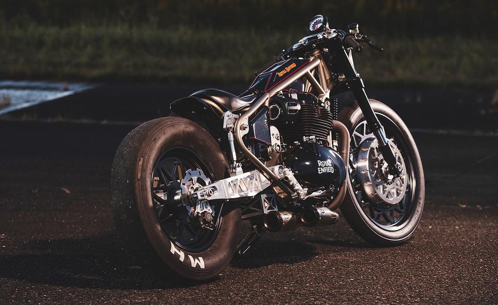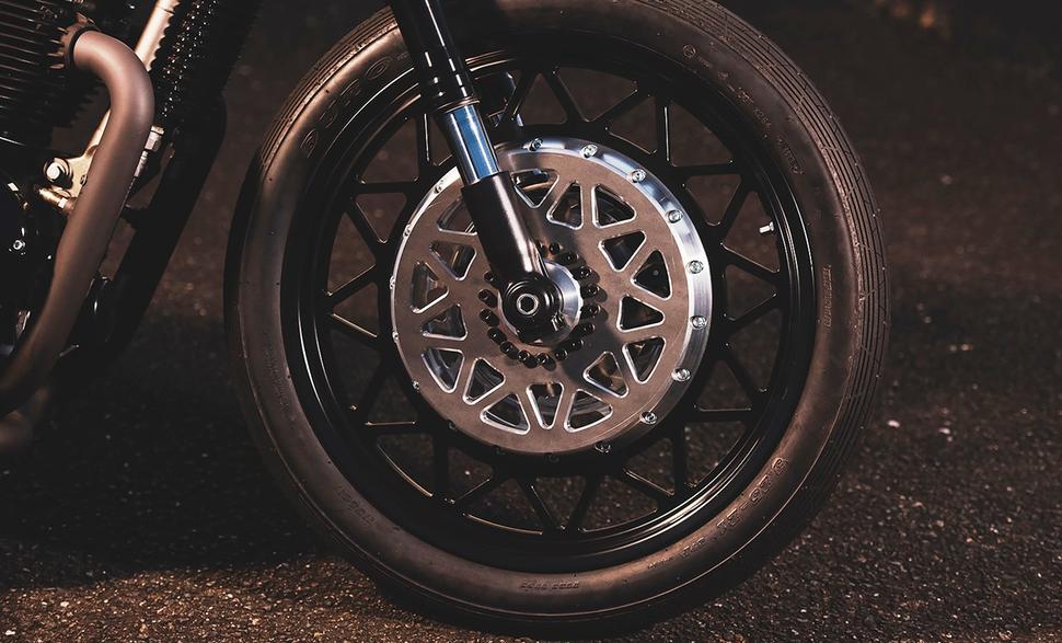 Шикарные алюминиевые колёса Энфилда были сделаны с нуля. 21-е переднее красуется массивным кожухом вокруг ступицы, скрывающим под собой суппорт от Brembo. Сзади стоит 16-е колесо, от которого может запросто случиться когнитивный диссонанс: оно обуто в пухлый высокопрофильный слик. Но нет, это не переточенная автомобильная шина и не докатка - это специальная резина для дрэг-рейсинга, которая даёт отличный зацеп, но не особо предназначена для прохождения поворотов на скорости.