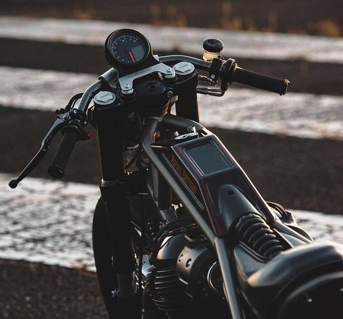 Разобравшись с ходовой частью, Такуйя украсил Shotgun 650 самодельным алюминиевым обвесом. Невероятно маленький бензобак уютно разместился между решётчатой передней частью рамы - он вмещает ровно столько бензина, сколько нужно для заезда в дрэг-рейсинге. Выпуклый кожух фары и куцее заднее крыло обрамляют образ мотоцикла.