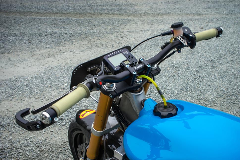 Обвес целиком подчинён функциональности, но при этом обладает неким шармом благодаря умелому подбору компонентов. Модифицированный плуг от KTM RC390 не только стильно выглядит, но и поймает жидкости из двигателя, если из него вдруг что-то вытечет. Топливный бак сверху полностью скрыт под кожухом Roland Sands super single. Трекерное сиденье Airtech Streamlining имеет карбоновые крепления, но очень тонкое и предоставляет чисто номинальный уровень комфорта. Карбоновое переднее крыло от R6 и кастомная теплозащита выпуска делают вес и так уже суперлёгкого мотоцикла ещё меньше.