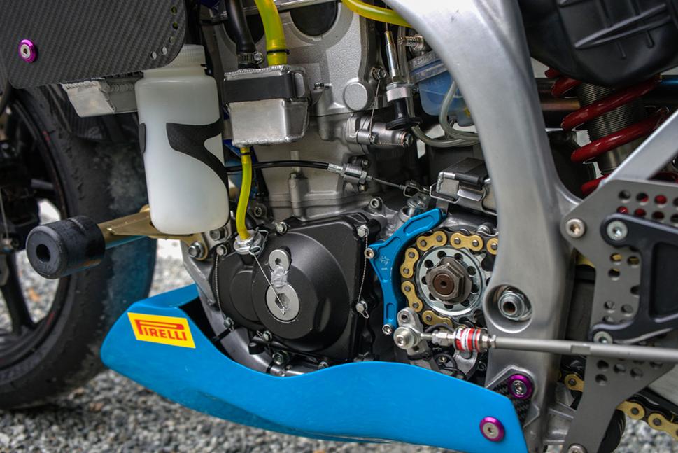 Стоковый 449-кубовый пятиклапанный двигатель жидкостного охлаждения с двумя верхними распредвалами вполне мощный и тяговитый, но этого недостаточно для Пайкс Пик. Том оснастил движок поршнем под повышенную степень сжатия от Wiseco и парой спортивных распредвалов Hot Cams stage 2, клапанами и пружинами Kibllewhite SS, карбюратором Lectron Fuel Systems с уловителем паров Graves Motorsport (он обязателен для тюнингованных мотоциклов по регламенту многих соревнований).