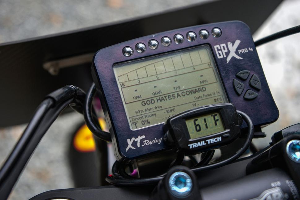 Но мощность - это лишь полдела. Для повышения надёжности двигателя в сложных условиях Том установил помпу охлаждающей жидкости Boyesen и увеличенные радиаторы Tuck. Титановый выпускной тракт DRD не только добавляет мощности двигателю, но и великолепно звучит и отлично выглядит. Корзина сцепления Wiseco передаёт тягу, а проскальзывающее сцепление STM предотвращает блокировку заднего колеса на резких переключениях вниз. И венчают всё это модуль зажигания (коммутатор) от Graves и квикшифтер Dynojet, делающие езду плавной и комфортной.