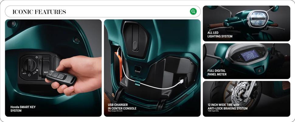 Новейший скутер Honda Stylo 160 оснащён множеством современных приятных особенностей типа диодного света, ABS и комбибрейка, бесключевого зажигания Honda SmartKey, USB-розетки для зарядки смартфона, а также чёткого цифрового дисплея.