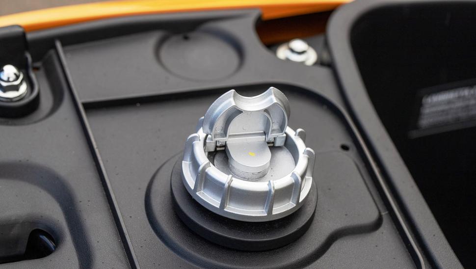 Находясь в поле действия бесключевого доступа с брелоком в кармане, просто нажимаешь выключатель зажигания - и питание включается. Поворот выключателя вправо открывает крышку перед левым коленом, откуда есть доступ к пробке радиатора, а если тот же выключатель повернуть влево - откроется подседельный кофр, там же находится и набор инструментов. Крышка бензобака тоже расположена под седлом, поэтому открывается просто вручную, без ключа, но сама она вместо обычной резьбы имеет довольно изящный механизм фиксации.