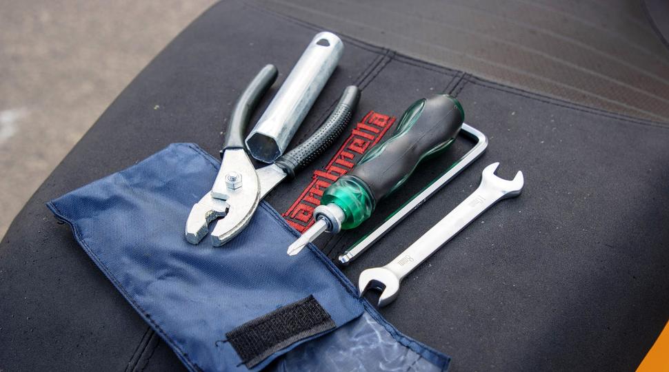 Правда, стоит учитывать, что там, в подседельном кофре, на ходу становится довольно тепло, так что скоропортящиеся продукты и боящиеся нагрева вещи оставлять там не стоит. Зато там имеется довольно внушительный набор инструментов с ключом на 8 и 10мм, отвёртка-перевёртыш с крестовым и плоским жалом, свечная головка, 5-миллиметровый шестигранник и плоскогубцы.