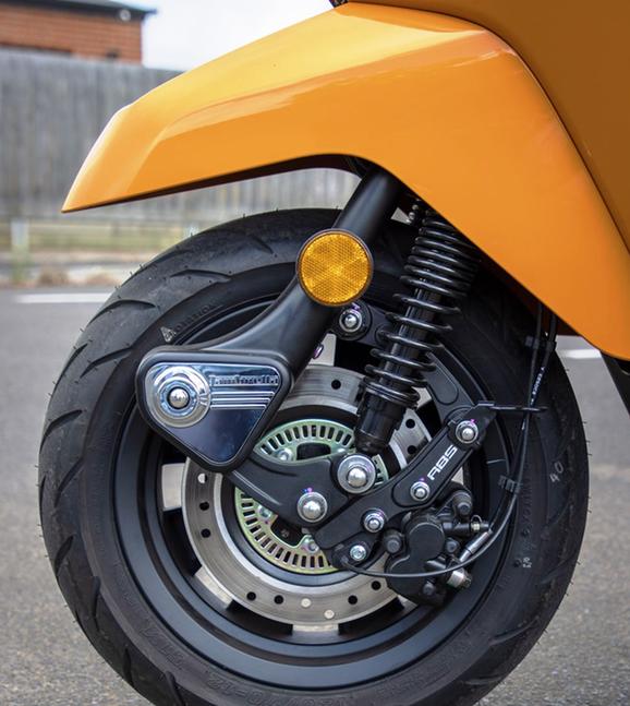 Двухрычажная передняя подвеска сзади дополнена классическими двумя стойками с регулировкой преднатяга, которых более чем хватает для Lambretta X300. Передний тормоз однодисковый, с ABS, потребовал достаточно решительного выжима, но скутер приехал на тест с нулём километров на одометре, и тормозное усилие росло по мере прирабатывания колодок, вместе с информативностью. Вероятно, что с ростом пробега тормоз станет ещё эффективнее.