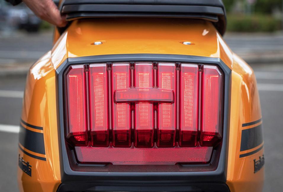 Lambretta X300 2025 имеет массивную заднюю часть, что только подчёркивается впечатляющего размера задним фонарём (280мм вширь и 200мм в высоту). Поверх расположено длинное и широкое двухместное седло, под которым имеется багажный отсек. В него, к сожалению, не помещается полнолицевой шлем, но открытый вместится без вопросов, да ещё и останется место для каких-нибудь полезных мелочей.