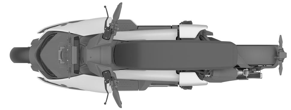 Также патентные заявки позволяют немного познакомиться с техническими особенностями мотоцикла благодаря нескольким подробным эскизам. Например, вопреки первому впечатлению о типично скутерной эргономике, по сути этот двухколёсный аппарат одинаково далёк и от бензиновых мотоциклов с баком между коленями, и от скутеров с поликом и тоннелем под ногами. Здесь между ногами райдера находится аккумуляторный блок, который проходит вдоль платформ во всю длину и занимает довольно внушительный объём. Мотор установлен прямо позади батареи, а привод заднего колеса реализован через редуктор и ремённую финальную передачу. Ни сцепления, ни коробки передач у CE 04 нет - в этой части эргономики он напоминает равно скутер и мотоцикл с АКПП.