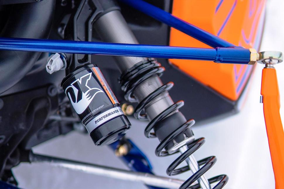 Колея широких передних лыж Yamaha Mountain составляет 102 сантиметра. Передние газонаполненные амортизаторы Fox Zero QS3 имеют возможность регулировки усилия сжатия. Рулевой механизм – от модели SR-M Mountain.