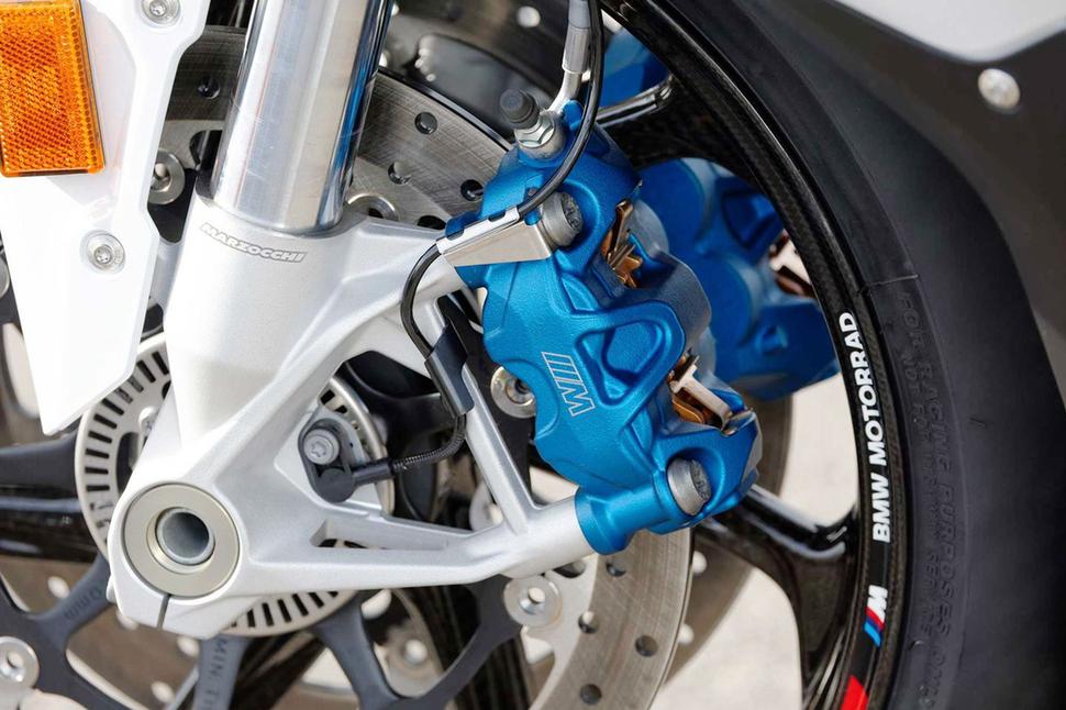 Электронные аспекты тормозной системы BMW S 1000 RR уже были упомянуты выше, а с аппаратной точки зрения она состоит из пары синих анодированных радиальных четырёхпоршневых суппортов Nissin на 320-х дисках спереди и однопоршневого Nissin на 220-м диске сзади. Штатные рычаги на руле довольно неплохи, но в составе пакета M Billet Package доступны весьма хитроумные фрезерованные рычаги.
