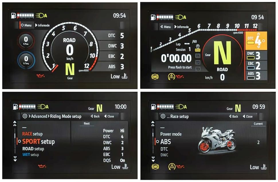 Новый Ducati Panigale V2 стал легче примерно на 17кг и весит около 181кг с полным 15-литровым баком. Другие его элементы более привычны и знакомы, например, подвески Ohlins на тестовом экземпляре модели S, или тормоза Brembo. Полный комплект электронных ассистентов тоже никуда не делся: трекшн-контроль, вилли-контроль, наклонная ABS, управление торможением двигателем и карты отклика на газ, всё это настраивается через новый пятидюймовый TFT-дисплей при помощи четырёхпозиционного джойстика на левом пульте.