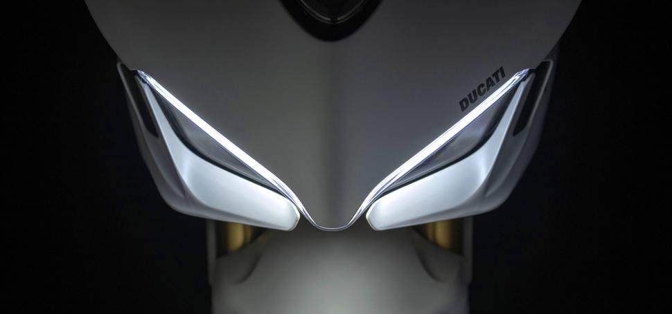 Над хмурыми фарами Ducati SuperSport 950 расположены диодные ходовые огни, V-образная форма которых теперь меньше походит на монобровый дизайн прошлой версии. По бокам от фар находятся дополнительные небольшие воздухозаборники, направляющие воздух внутрь капотировки, откуда он выходит на ноги райдера. Что ж, в прохладный период это может быть даже плюсом. Интересное решение применили дизайнеры для установки ветрового стекла: оно расположено поверх пластика обтекателя, а между ними установлена 4,3-дюймовая цифровая приборная панель.