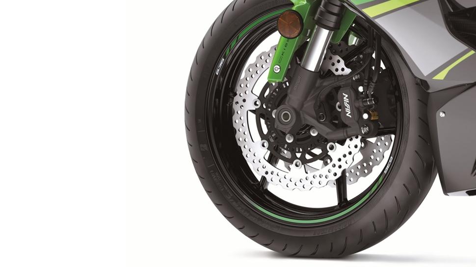 Пара четырёхпоршневых суппортов Nissin на двух 310-х дисках составляют переднюю тормозную систему, а задняя состоит из однопоршневого суппорта на 210-м диске. 636-й Kawasaki Ninja ZX-6R доступен в том числе в комплектации с ABS на обоих колёсах.