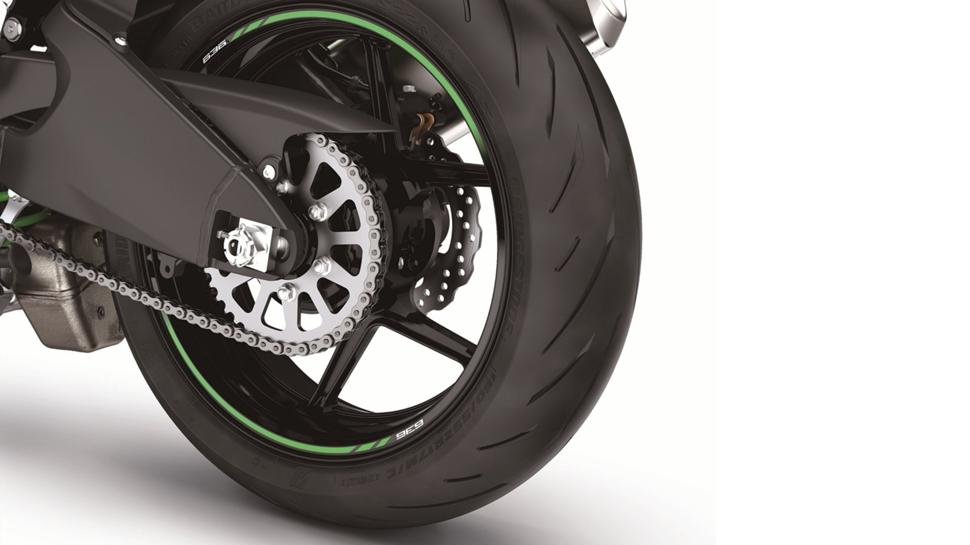 Штампованная алюминиевая периметральная рама с литым подрамником, состоящим из двух частей и внушительным маятником образуют несущую конструкцию этого зверя. Симметричные 17-дюймовые литые колёса обуты в Battlax Hypersport S22 - 120/70 спереди и ещё более широкое 180/55 сзади.