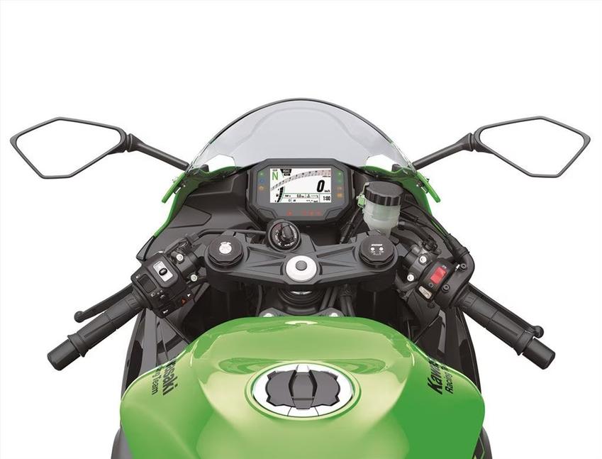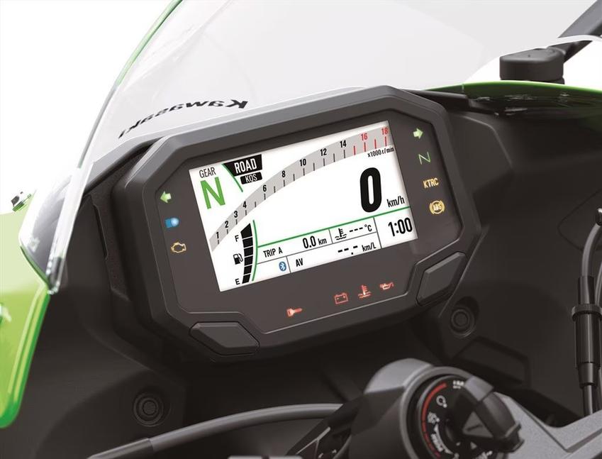 Олдскульная аналоговая приборная панель была заменена на 4,3-дюймовый полноцветный TFT-дисплей, придающиё ZX-6R 2024 года ещё более современный вид. Здесь на выбор предлагаются четыре режима тяги - Спортивный, Дождевой, Дорожный и Пользовательский, которые также влияют на настройки трекшн-контроля - штатного, хоть и не настолько продвинутого, как системы на базе инерциального блока. Новая приборная панель умеет соединяться со смартфоном с установленным на нём приложением Kawasaki Rideology.