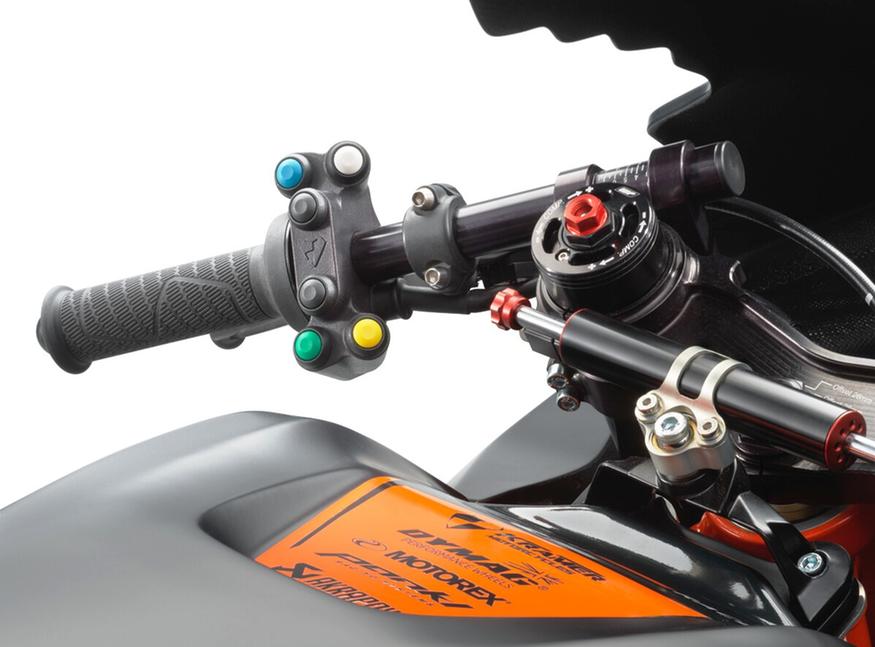 Обновлённая приборная панель с GPS-логгером подробно отслеживает и позволяет проанализировать каждый заезд, а пульты на руле на основе KTM RC16 обеспечивают удобное управление электроникой, в то время как левая нога переключает расположенные в трековом порядке передачи при помощи квикшифтера.