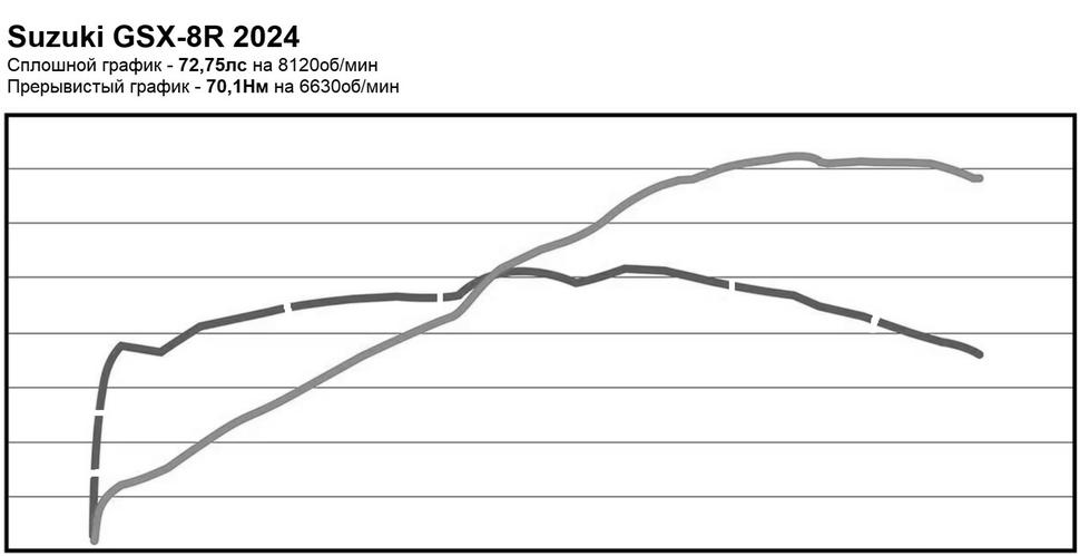 Заправленный и полностью снаряжённый Suzuki GSX-8R 2024 года весит 205,5кг, а на диностенде этот мотоцикл показал пиковые 72,75лс на 8120об/мин и 70,1Нм на 6630об/мин с колеса. Для сравнения, Suzuki GSX-8S 2023 года на том же стенде показал 74лс и 70,9Нм, а Suzuki V-Strom 800DE - 72,2лс и 68Нм тяги. Графики мощности всех трёх моделей практически идентичны, и это отчасти объясняет, почему выходит всё больше моделей на рядных двойках. Эта компоновка двигателя крайне универсальна, и таким мотором можно оснастить и турэндуро, и нейкед, и спортбайк - и всё будет работать как надо. Suzuki GSX-8R 2024 года может похвастаться тяговитыми низами и средними оборотами, которые одинаково радуют и при городской езде, и на треке.