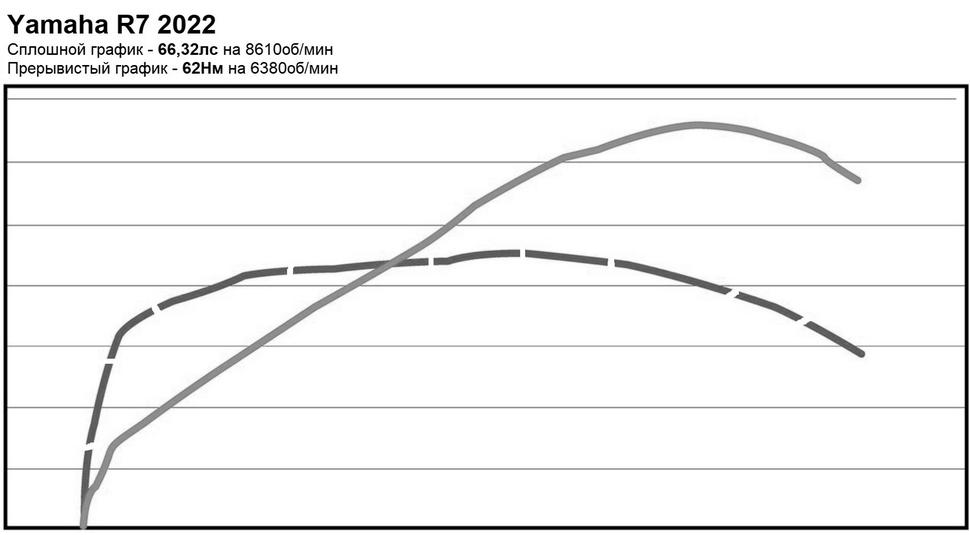 На диностенде Yamaha R7 2022 года показала пиковые 66,32лс на 8610об/мин и 62Нм на 6380об/мин. Несмотря на относительно скромные цифры, плавная характеристика двигателя и ровная полка момента обеспечивают гибкость в выборе передач на любых участках дороги, предоставляя доступную полезную мощность во всём диапазоне оборотов.