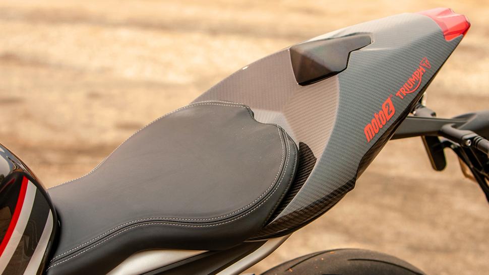 Новый мотоцикл легче предшественника благодаря карбоновому обвесу, одиночному сиденью (пассажирское оборудование вообще отсутствует) и переходу на электронный газ - впервые в линейке Daytona. Triumph заявляет, что сухой вес модели составляет 164 кг, что в общем-то никому не интересно, потому что на сухих мотоциклах не ездят.