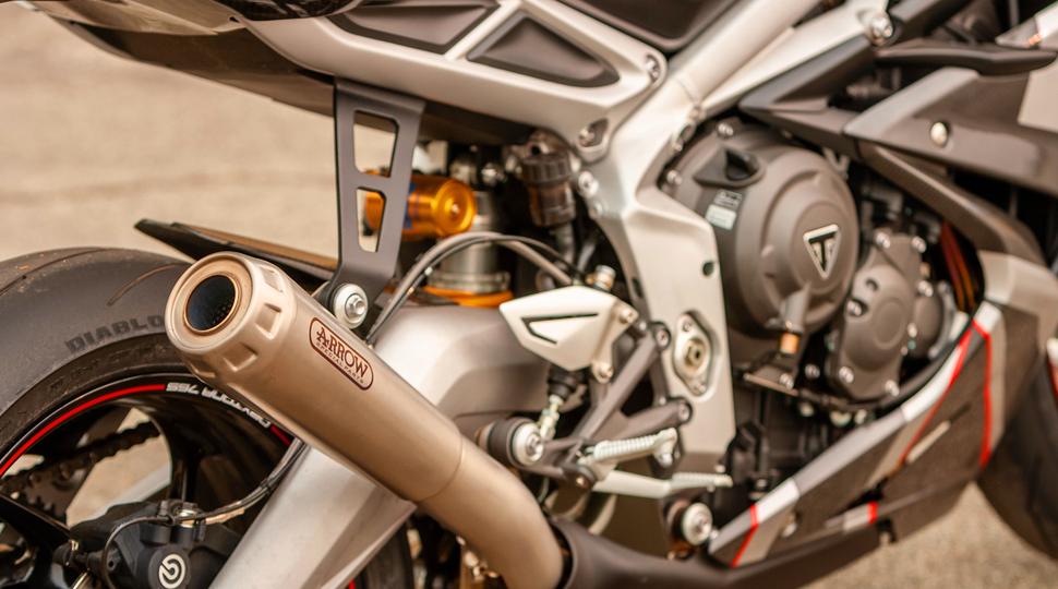 Это, в свою очередь, подводит нас к близкому знакомству с квикшифтером Triumph Shift Assist (TSA) - общаться с ним приходится часто. Возможно, литровые спортбайки сделали меня несколько ленивым, но переключаться на 765 мне почти надоело. Переключаться вверх на полном газу особенно прикольно было при выходе из правого поворота с увеличивающимся радиусом, где надо ускоряться, всё ещё свисая вправо. Благодаря квикшифтеру не приходится совершать рывок газом, вися в неудобном положении, достаточно просто поднять лапку носком - правда, нагружая при этом внешнюю ногу. Вот где обратная коробка была бы очень кстати, но это отдельный разговор.