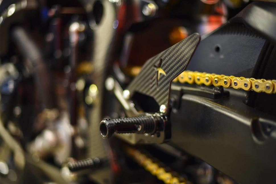 Настраиваемые подножки GP EVO, охлаждение тормозных суппортов, защита рычагов, защита картера были выполнены на станке с ЧПУ из цельного слитка алюминия. Ryuyo также имеет плексиглассовый ветровик в стиле MotoGP и неопреновое сиденье HP. Bonamici предоставила некоторые алюминиевые детали - накладку траверсы и крышку бензобака.