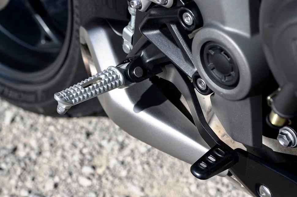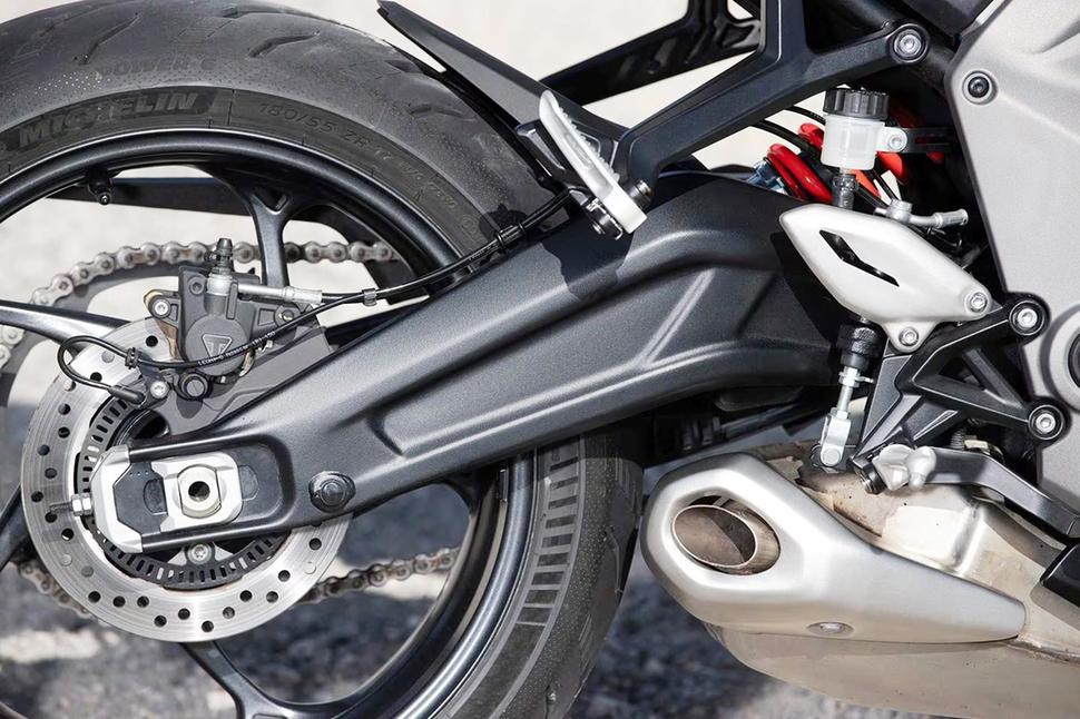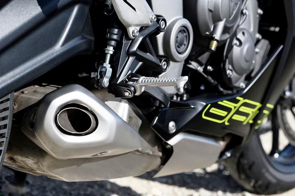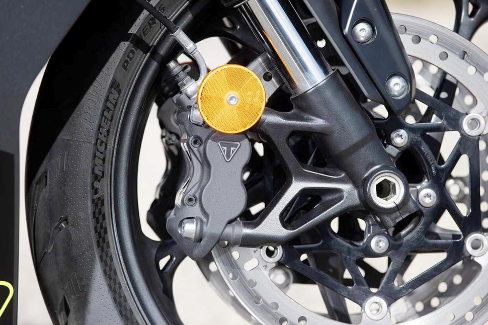 Если на Trident спереди стоят два двухпоршневых суппорта, на Daytona 660 установлены два радиальных четырёхпоршневых, брендированных Triumph и очень похожих на J.Juan, на 310-миллиметровых дисках. Магистрали армированные, и в целом тормозная система, как и подвески, неплохо справляется в пределах обычных дорожных скоростей. По городу вообще без нареканий, и только когда начинаешь наваливать, хочется чуть больше мощности и закуса от передних суппортов. Честно говоря, в тормозах Daytona нет ничего плохого, просто сейчас на многих спортбайках стоят топовые Brembo, и это изменило ожидания о том, на что способны современные тормозные системы. Что ж, остаётся просто помнить про цену и целевую аудиторию Daytona.