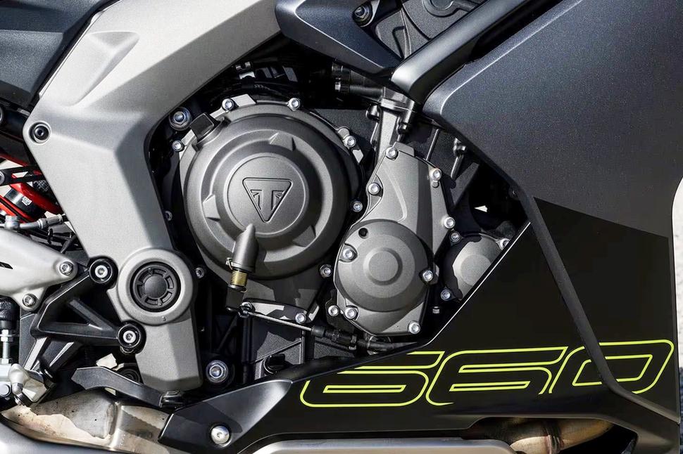 Первое, что нужно знать о моторе Daytona - это то, что он основан на двигателе от Trident и Tiger Sport 660, с некоторыми доработками, повышающими производительность. Рядная тройка Daytona уникальна для этого класса и выделяет эту модель среди конкурентов. Её 660 кубиков рабочего объёма обусловлены тремя цилиндрами диаметром 74,0мм с ходом поршней в 51,1мм и 240-градусным порядком вспышек.