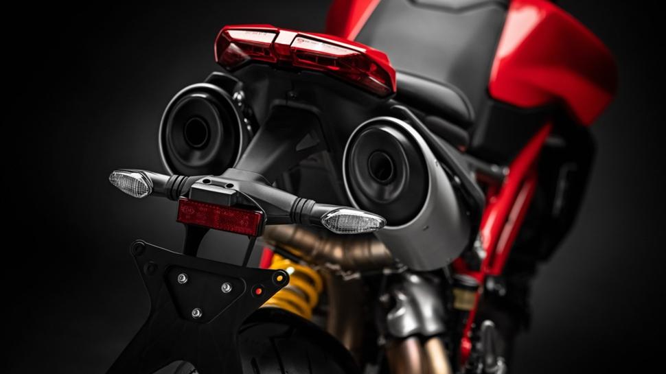 К заднему брызговику крепится номерной знак и поворотники на выносах, а небольшое дополнительное крыло защищает от брызг подвеску и двигатель. Зияющее пространство между задним колесом и подрамником частично прикрыто выхлопной системой, заканчивающейся парой косо обрубленных глушителей по обеим сторонам мотоцикла. Глушители имеют небольшие защитные панели, так что пассажиру нужно быть аккуратным, чтоб не обжечься, особенно на правой стороне, где проходят трубы выпускного коллектора.