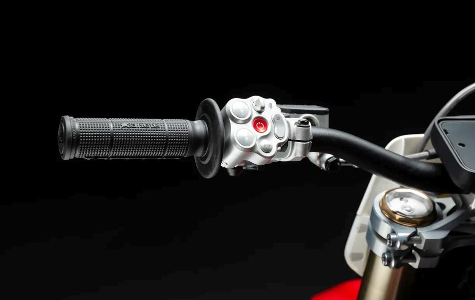 Осаживает Varg SM мощная, заточенная под асфальт тормозная система, которая управляется главным цилиндром Brembo 18x21, но ни по информативности, ни по эффективности торможения она почему-то не оправдывает ожиданий. Рычаг имеет небольшой, но вполне ощутимый свободный ход, а затем резко срабатывает. Это не касается заднего тормоза, рычаг которого находится там, где у бензиновых мотоциклов сцепление, то есть, на левой стороне руля. И вот он просто великолепен: управление тормозным усилием гораздо точнее, когда осуществляется пальцами, а не ногой в кроссовом ботинке. Правда, в зависимости от местного законодательства, в некоторых странах на Varg SM будет установлена ещё и педаль заднего тормоза, но и ручной тормоз будет входить в комплект. То же самое касается встроенных поворотников: они запрещены, например, в США, но останутся в комплекте в качестве дублёра поворотников "на ножках".
