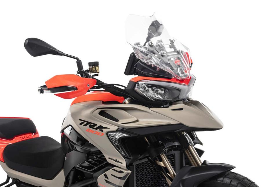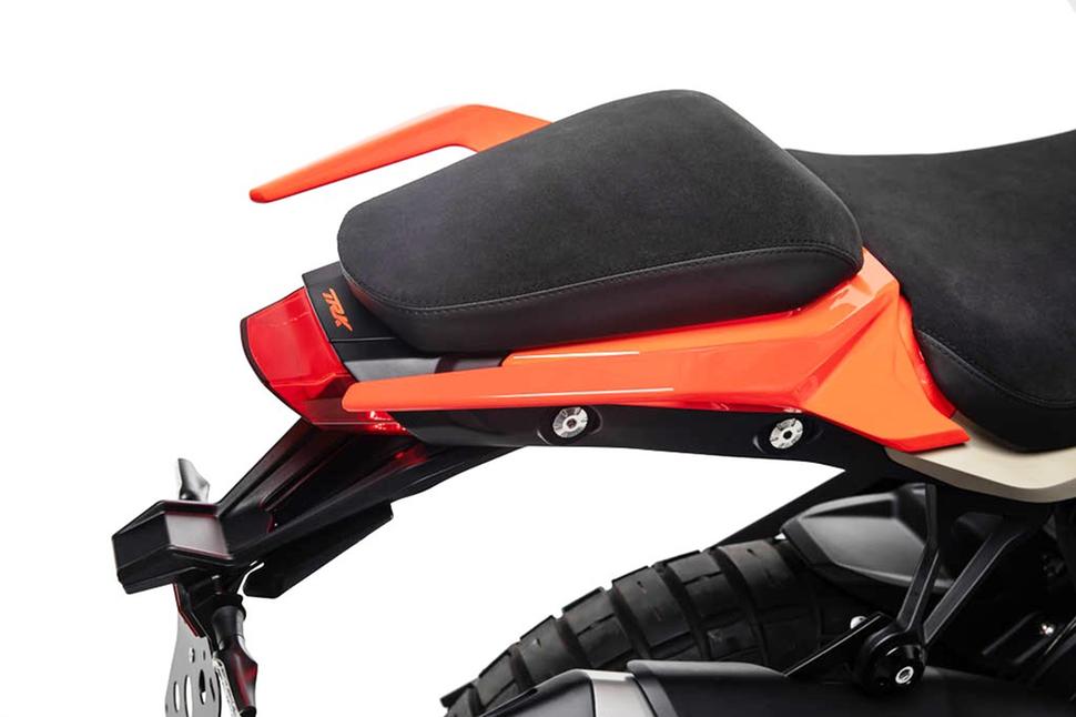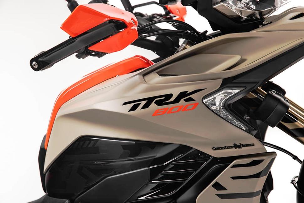 Защиту райдера от ветра осуществляет большое ветровое стекло и защитные дефлекторы на ручках руля. Из других особенностей мотоцикла стоит отметить узкое просторное седло, прочные пассажирские ручки и центральную подставку. Удобная, интуитивная приборная панель TRK 800 выполнена в виде 7-дюймового цветного TFT-дисплея высокого разрешения, правда, пока не сообщается, есть ли в ней функция беспроводной связи со смартфоном. Зато назван объём бензобака, он составляет 21 литр.