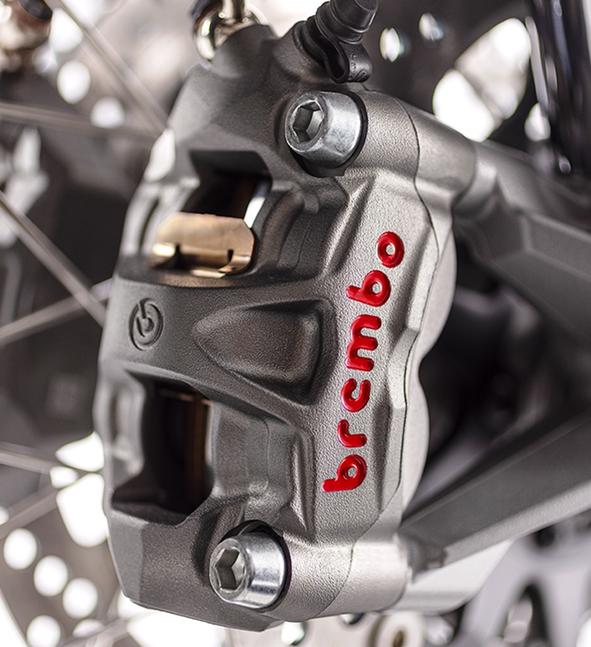 На переднем колесе стоит пара массивных четырёхпоршневых моноблочных суппортов Brembo M50, сзади - один двухпоршневой суппорт. ABS имеет три ступени регулировки и на верхней обладает чувствительностью к наклону. Настройка происходит при помощи 5-дюймового TFT-дисплея, а ещё ABS можно полностью отключить нажатием одной кнопки на левом пульте.