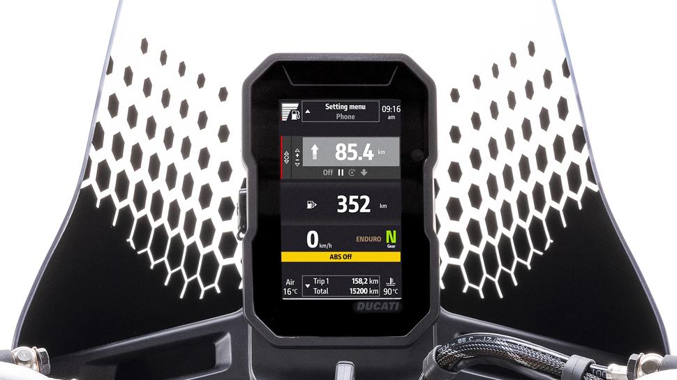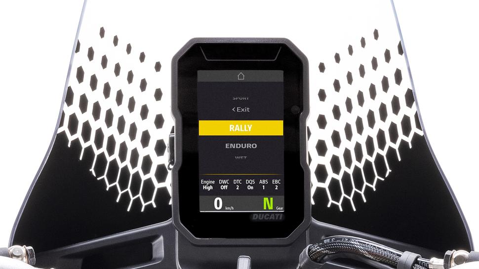 Ducati даже выпустили специальную таблицу, содержащую стоковые значения для каждого из режимов и включающую колонку с "назначением" того или иного режима. Из неё становится понятно, что пиковая мощность в 110лс доступна в Спортивном, Туристическом и Раллийном режимах, а в остальных она больше или меньше приглушена. В Дождевом и Городском режимах пиковая мощность приглушена до 95лс, а в режиме Эндуро - аж до 75лс. Этот режим предназначен для тех, кто мало знаком с внедорожной ездой на тяжёлом мотоцикле, поэтому тут включена ABS на обоих колёсах и трекшн-контроль. Зато на обоих внедорожных режимах отключен вилли-контроль, чтобы в любой момент можно было поднять переднее колесо для прохождения высоких неровностей типа брёвен или камней. В Раллийном режиме раскрывается полный потенциал мотоцикла, отключается ABS на заднем колесе и снижается её вмешательство на переднем, также снижается вмешательство трекшн-контроля. При желании ABS и трекшн-контроль можно полностью отключить.
